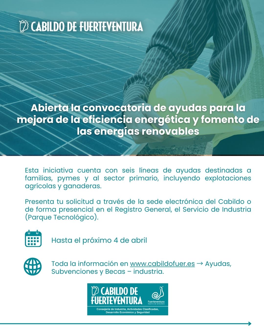 El Cabildo de Fuerteventura, a través de la Consejería de Industria, ha abierto el plazo para solicitar las subvenciones para la mejora de la eficiencia energética y fomento de las energías renovables de 2026. La Corporación insular promueve seis líneas de ayudas diferentes, que pueden ser solicitadas hasta el próximo 4 de abril, a través de la sede electrónica del Cabildo o de forma presencial.