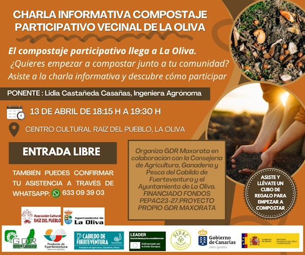GDR Maxorata y el Cabildo de Fuerteventura, a través de la Consejería de Agricultura, Ganadería y Pesca, que dirige Enrique Pérez, imparten una charla informativa sobre compostaje participativo vecinal. Esta actividad se desarrollará en el Centro Cultural Raíz del Pueblo (La Oliva), el próximo 13 de abril, a las 18.15 horas, gracias a la colaboración de dicha asociación.