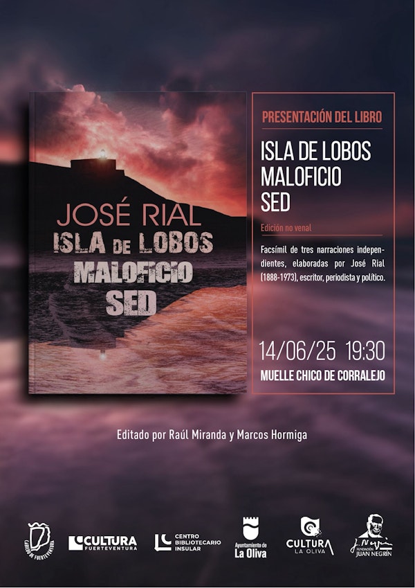 El Muelle Chico de Corralejo acogerá este sábado, 14 de junio, a las 19.30 horas, la presentación del libro que recopila las novelas Isla de LobosMaloficio y Sed de José Rial, editado por los majoreros Raúl Miranda y Marcos Hormiga. La presentación se desarrolla gracias a la coordinación del Cabildo de Fuerteventura y el Ayuntamiento de La Oliva, desde sus áreas de Cultura.