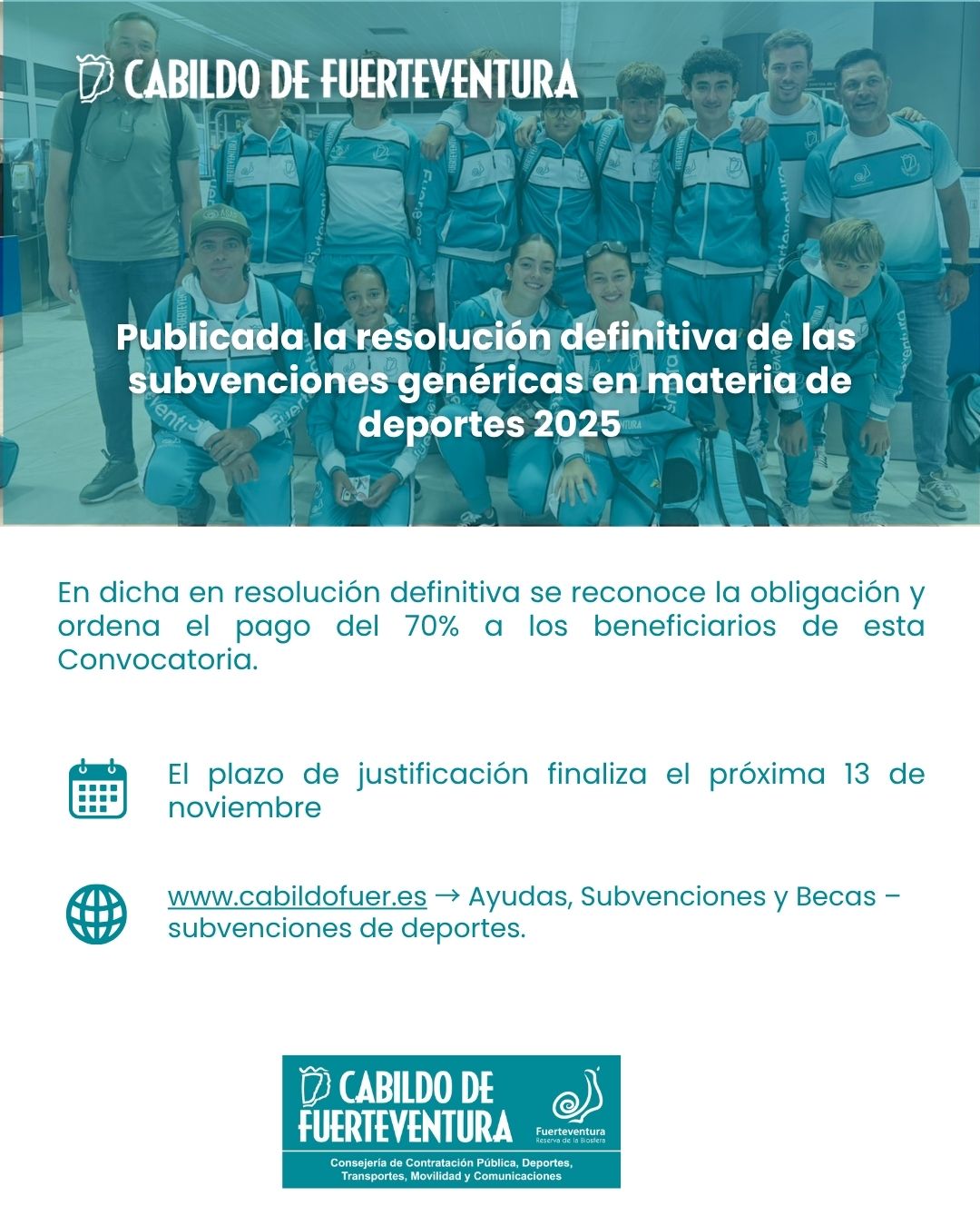 El Cabildo de Fuerteventura, a través de la Consejería de Deportes, ha publicado la resolución definitiva de la convocatoria de subvenciones en materia deportiva de esta anualidad, que ya se encuentra a disposición de cualquier persona interesada.