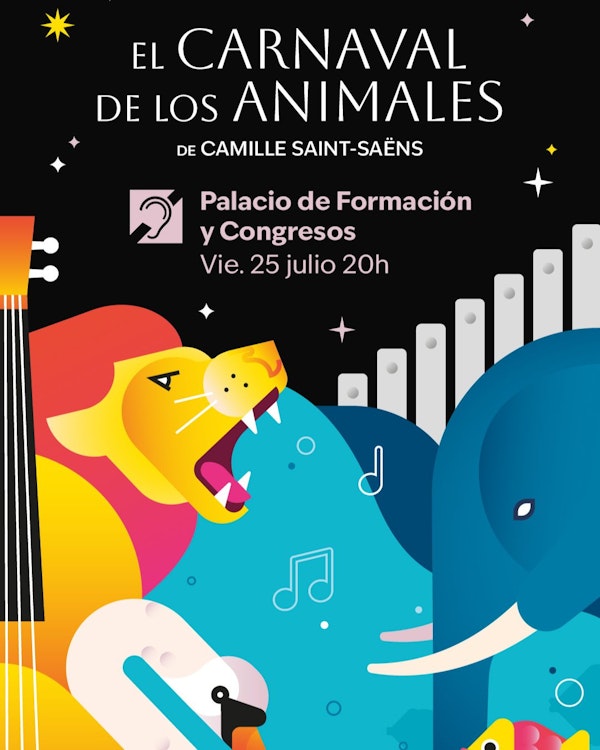 La segunda parte, que incorpora Víctor Lemes como narrador, será para ‘El carnaval de los animales’. Esta pieza fue compuesta por Saint-Saëns en 1886 y es una suite en catorce movimientos que realizó durante unas vacaciones en Austria como una especie de broma musical para entretener a sus amigos. De hecho, prohibió que se publicara o se interpretara en vida, con la excepción del movimiento ‘El cisne’, que consideraba serio y bello. Así que la obra fue estrenada públicamente después de su muerte en 1922 y se volvió muy popular desde entonces, ya que, aunque se trata de una obra humorística, está compuesta con gran maestría y conocimiento profundo del color instrumental.