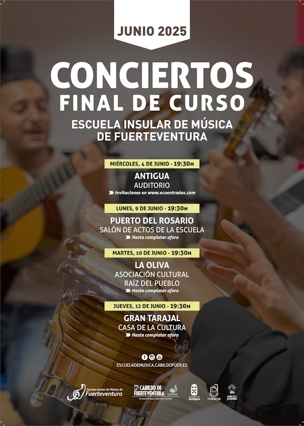 La Escuela Insular de Música de Fuerteventura celebra sus tradicionales conciertos de fin de curso durante el mes de junio con actuaciones programadas en cuatro municipios de la isla. Estas presentaciones contarán con la participación del alumnado de distintas especialidades, que mostrará el trabajo desarrollado a lo largo del año académico.