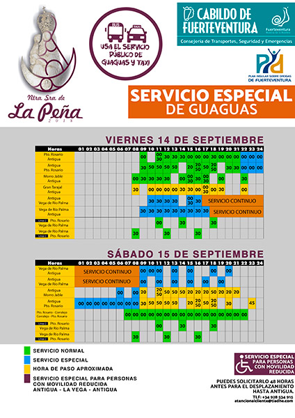 El servicio especial de guaguas funcionará desde las 09:30 del viernes 14 de septiembre, día festivo insular, y la mañana del sábado día 15, al ser los periodos de mayor afluencia de público. El dispositivo especial contará con 25 guaguas, con salida continua entre Antigua y La Vega de Río Palmas. Habrá otras 9 guaguas directas entre Puerto del Rosario y Antigua, y entre Morro Jable y Antigua. Asimismo, se refuerza la conexión directa entre Antigua y Puerto del Rosario en la madrugada del viernes al sábado, y durante todo el día del sábado funcionarán guaguas de manera regular entre Antigua y Morro Jable y entre Puerto del Rosario y Corralejo.