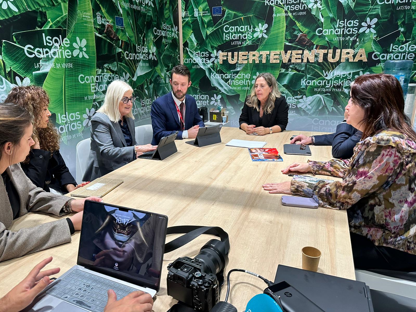 Dentro de la agenda de trabajo de la feria se han mantenido reuniones con el operador Jet2 que ha expresado su apuesta por Fuerteventura para este año y el próximo, que se va a materializar con un incremento de más del 20% de plazas hacia la Isla y la apertura de una nueva ruta con Liverpool. Los representantes de la compañía han comunicado al Patronato de Turismo que han adquirido más de un centenar de aviones con carburantes sostenibles que se irán incorporando en los próximos años al servicio y garantizan así la continuidad de sus rutas a precios competitivos ya que no estarán penalizados por las tasas fiscales que algunos países están comenzando a aplicar al transporte aéreo no sostenible. Jet2 trabaja con 73 hoteles de la Isla y es uno de los turoperadores más importantes y estratégicos.