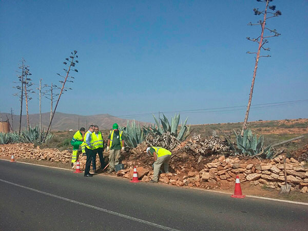 Carreteras, trabajo de campo: retranqueo de muros y demolición de tramos con riesgo de derrumbe. (Carreteras de Villaverde- Cruce de Lajares, La Corte- Antigua, Antigua -Triquivijate).