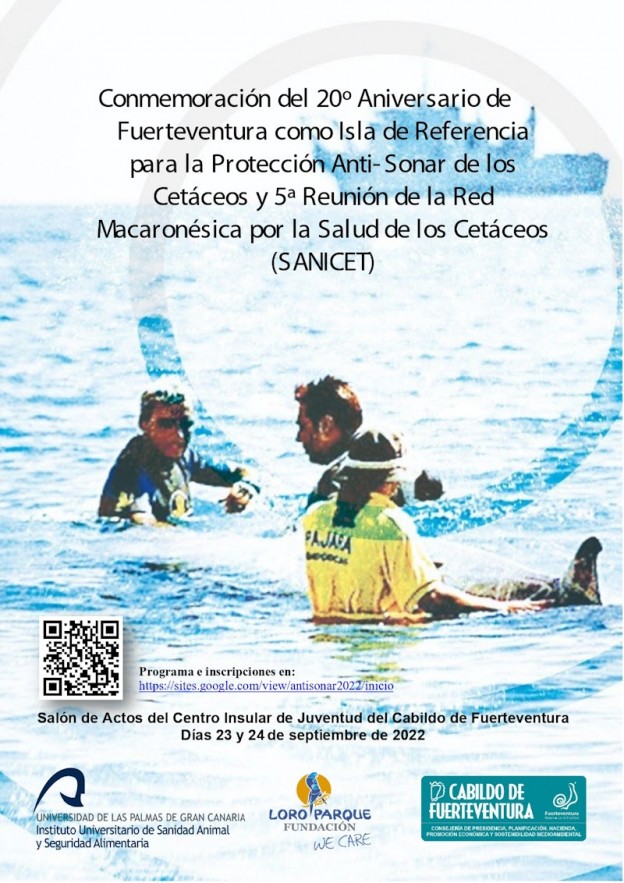 La Consejería de Sostenibilidad Medioambiental del Cabildo de Fuerteventura recuerda que están abiertas las inscripciones para las jornadas que conmemoran el 20ª Aniversario de Fuerteventura como referente para la protección anti-sonar de los cetáceos y la 5ª Reunión de la Red Macaronésica por la Salud de los Cetáceos (SANICET). La cita tendrá lugar los días 23 y 24 de septiembre en el Salón de Actos del Centro Insular de Juventud del Cabildo de Fuerteventura y estarán abiertas al público previa inscripción en https://sites.google.com/view/antisonar2022/inicio