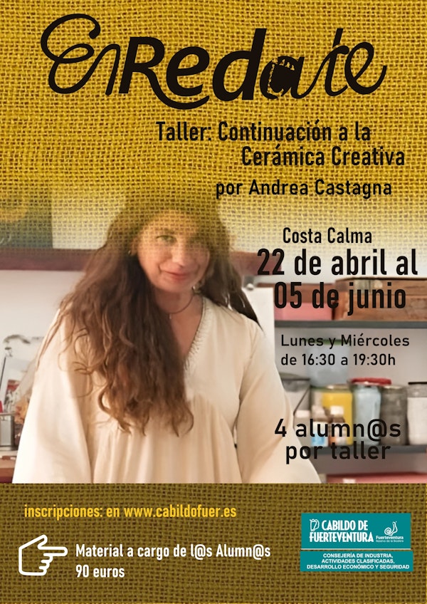 Taller de Cerámica Creativa, a cargo de Andrea Castagna en Costa Calma del 22 de abril al 5 de junio los lunes y miércoles de 16:30 a 19:30 horas;
