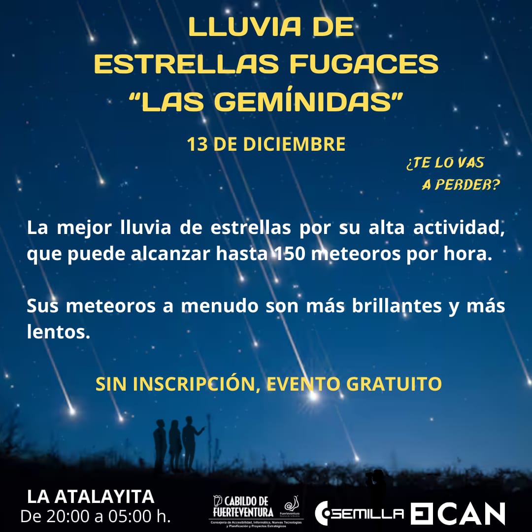 El Cabildo de Fuerteventura, a través de la Consejería de Accesibilidad, Informática, Nuevas Tecnologías y Planificación y Proyectos Estratégicos, organiza una gran noche de observación de la lluvia de estrellas de las Gemínidas en el entorno del poblado de La Atalayita, uno de los espacios de referencia de la isla para la astronomía. La actividad coincide con el máximo de esta lluvia de meteoros, una de las más intensas del año, que en 2025 podrá alcanzar hasta 150 meteoros por hora bajo cielos oscuros.