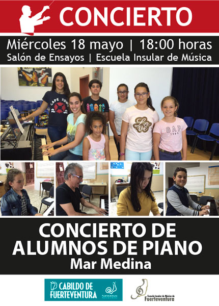 Alumnos de piano de la Escuela Insular de Música, dependiente del Cabildo de Fuerteventura, ofrecen mañana, miércoles, 18 de mayo un concierto. El evento comenzará a las 18.00 horas, en el Salón de Ensayos de la Escuela Insular de Música, en el Palacio de Formación y Congresos. El concierto correrá a cargo de la profesora de piano de la Escuela Insular de Música, Mar Medina.