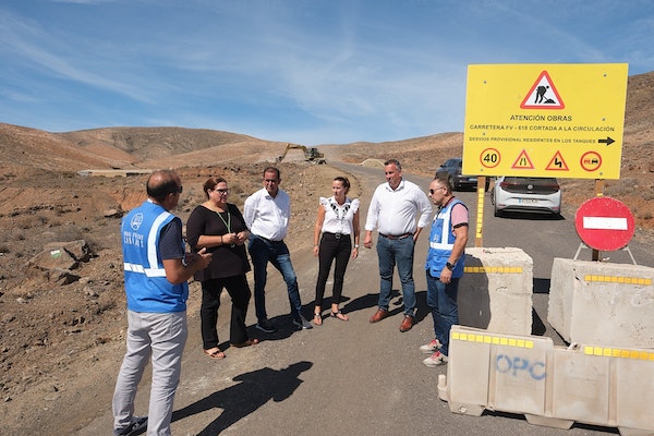 La presidenta del Cabildo, Lola García, y el consejero de Infraestructuras y Carreteras, Blas Acosta, comprobaron el avance de los trabajos, acompañados por la alcaldesa de Tuineje, Candelaria Umpiérrez, y el concejal de Obras Públicas del Ayuntamiento de Pájara, Alexis Alonso.