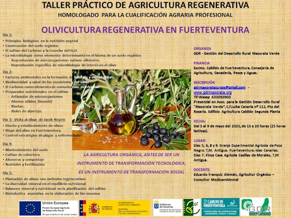 El primer taller, Olivicultura Regenerativa en Fuerteventura, comenzará el próximo 5 de mayo y se desarrollará hasta el día 9, de 15:00 a 20:00 horas. Durante cinco días, los asistentes podrán formarse en todo lo relacionado con la olivicultura regenerativa en la isla, aprendiendo aspectos básicos como el mantenimiento del suelo, la fertilización de este o cómo crear preparados nutricionales en el cultivo. El agricultor orgánico y consultor ambiental Eduardo Franquiz Alemán será el encargado de desarrollar estos conceptos y de explicar cómo la agricultura orgánica, antes de ser un instrumento de transformación tecnológica, es un instrumento de transformación social.