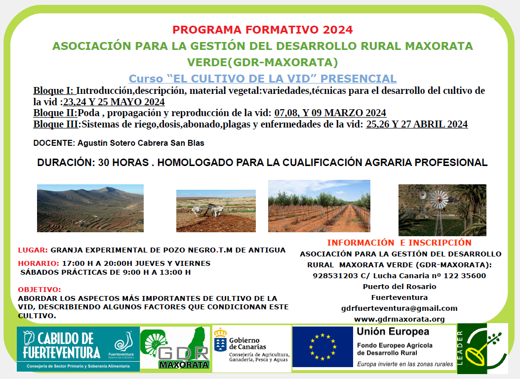 El Cabildo de Fuerteventura, a través del área de Agricultura, Ganadería y Pesca, que dirige Matías Peña, y la Asociación para la Gestión del Desarrollo Rural Maxorata Verde (GDR), impartirán una formación totalmente gratuita sobre el cultivo de la vid, con el objetivo de abordar los aspectos más importantes y describir algunos de los factores que condicionan este cultivo.