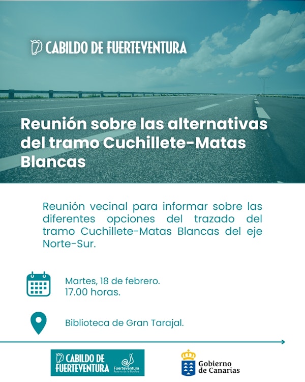 El Cabildo de Fuerteventura y el Gobierno de Canarias convocan una reunión con el objetivo de informar a vecinos y vecinas sobre las diferentes alternativas que existen del trazado del tramo Cuchillete-Matas Blancas del eje Norte-Sur, tras la paralización cautelar de su campaña geotécnica anunciada por el ejecutivo autonómico.