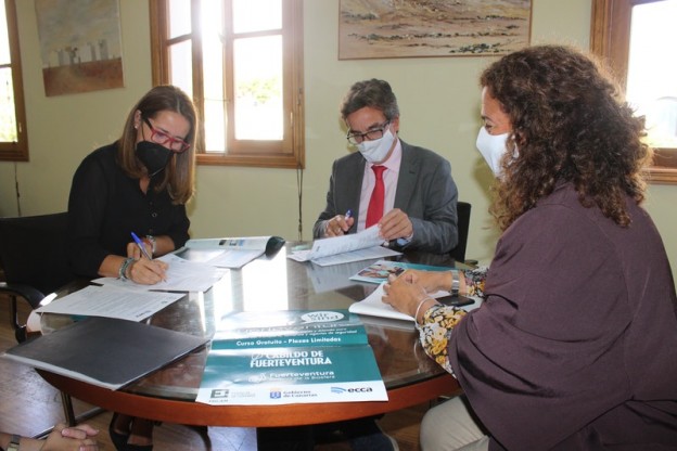 El Cabildo de Fuerteventura, en colaboración con Radio ECCA Fundación Canaria, impartirá cursos básicos de inglés y alemán dirigidos a mejorar las competencias en idiomas de aquellas personas interesadas en mejorar su atención al turista que visita la Isla. Los programas We Are Fuerteventura (inglés) y Wir Sind Fuerteventura (alemán) esperan alcanzar las 200 matrículas, gracias a un convenio suscrito entre la consejera del área, Lola García, y el director general de Radio ECCA Fundación Canaria, José María Segura.