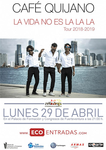 El grupo musical Café Quijano llega el próximo 29 de abril al Palacio de Formación y Congresos de Fuerteventura, con un concierto que dará comienzo a las 21.00 horas, enmarcado dentro de su gira dentro de su gira La vida no es La La La, Tour 2018-2019.