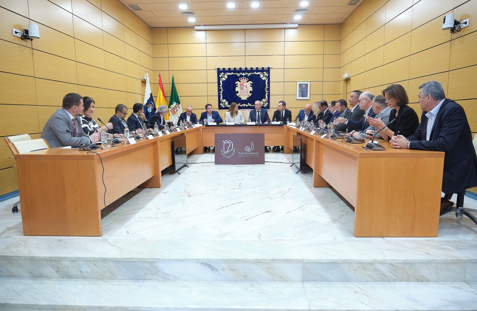 El Salón de Plenos del Cabildo Insular ha acogido a las 10 horas de esta mañana una reunión técnica con motivo de la puesta en marcha de la línea Puerto del Rosario – Tarfaya. En ella, todas las instituciones participantes han mostrado su apoyo y disposición en la puesta en marcha de una línea marítima que comportará beneficios para todo el archipiélago.