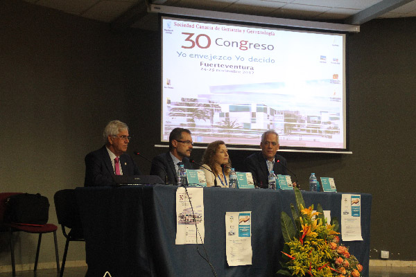 Casi 140 especialistas en el cuidado de mayores se reúnen desde hoy, viernes, día 24 de noviembre, en Fuerteventura en el XXX Congreso de la Sociedad Canaria de Geriatría y Gerontología. El evento, que fue inaugurado por el presidente del Cabildo de Fuerteventura, Marcial Morales, el alcalde de Puerto del Rosario, Nicolás Gutiérrez, el vocal de Fuerteventura, Carlos Eugenio Prieto Quintana, y la presidenta de la Sociedad Canaria de Geriatría y Gerontología, Carmen Dolores Acosta Morales, se celebra en el salón de actos de la antigua Universidad Popular.