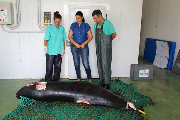 Un equipo de científicos del Instituto Universitario de Sanidad Animal y Seguridad Alimentaria de la Universidad de Las Palmas de Gran Canaria (Ulpgc) empezó hoy, martes, 15 de septiembre, a realizar la necropsia al cachalote pigmeo que apareció ayer, lunes, varado en la Playa de la Punta Leandro, en Pozo Negro, con el objeto de conocer las causas de la muerte del animal. El equipo, dirigido por Antonio Fernández, se trasladó a la Estación Biológica de Fuerteventura para coger las primeras muestras que permitirán realizar los pertinentes análisis que dirán si falleció por actividades derivadas por causa humana o por alguna enfermedad. Antonio Fernández detalló que se trata de un cachalote pigmeo macho, joven y que mide 2,5 metros.