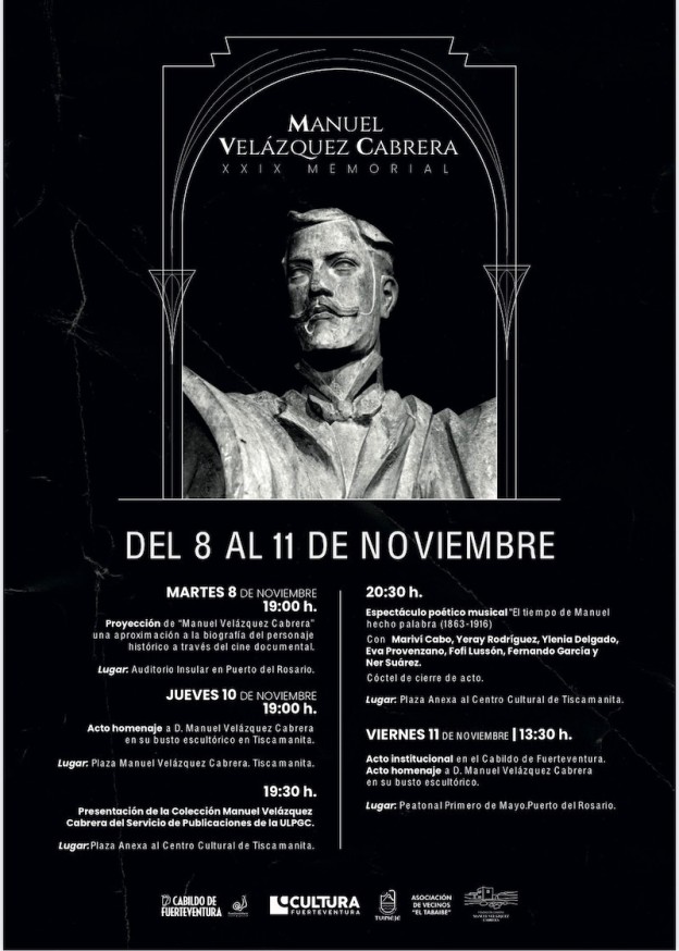 El jueves, día 10 de noviembre, a las 19.00 horas, se desarrollará en Tiscamanita el acto homenaje en el busto escultórico del político majorero en la plaza Manuel Velázquez Cabrera de Tiscamanita. A continuación, a las 19.30 horas, se presentarán los dos primeros libros publicados por la cátedra Manuel Velázquez Cabrera del Cabildo de Fuerteventura y la Universidad de Las Palmas de Gran Canaria. Se presentan las publicaciones Manuel Velázquez Cabrera (1863-1916) Huella y legado de un soñador de Felipe Bermúdez y, por otro, El Plebiscito de las Islas Menores, Manuel Velázquez Cabrera y la creación de los cabildos insulares de José Curbelo Sánchez.