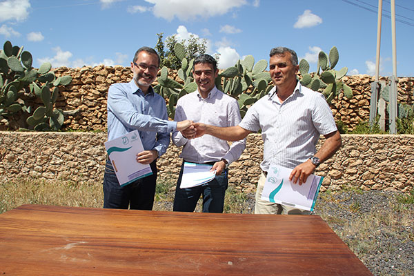 El consejero de Agricultura, Ganadería, Pesca y Aguas del Gobierno de Canarias, Narvay Quintero, el presidente del Cabildo de Fuerteventura, Marcial Morales, y el presidente de la Sociedad Cooperativa de Cosecheros y Exportadores de Fuerteventura (Coexfur), Fermín Pérez, han firmado hoy este acuerdo, que estará vigente hasta 2018, y cuenta con un presupuesto de 600.000 euros repartidos en tres anualidades.