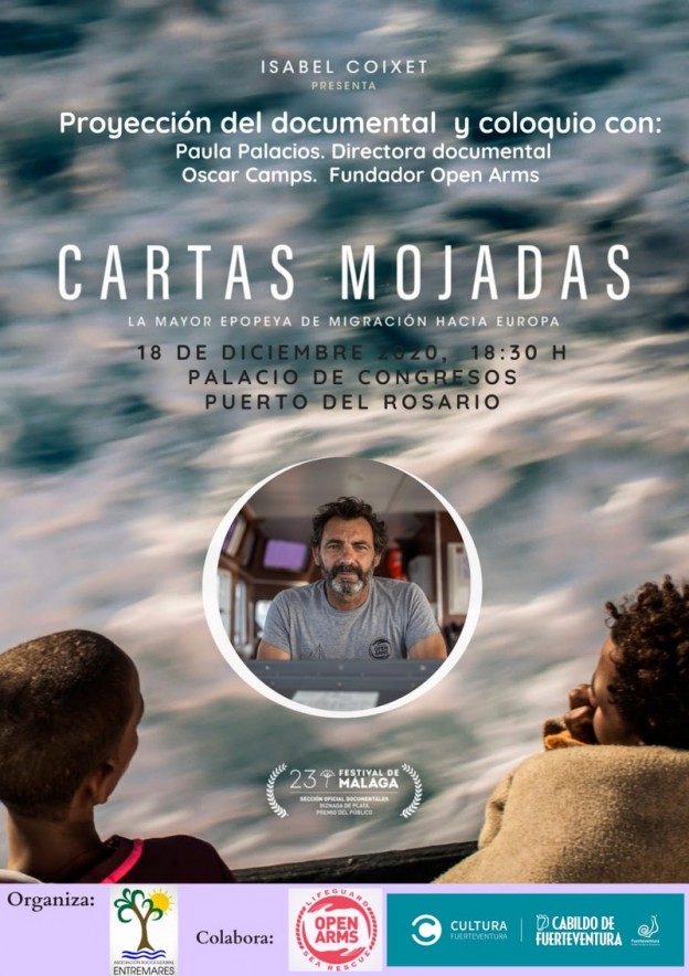 La Consejería de Cultura del Cabildo y la Asociación Sociocultural Entre Mares ofrecen la proyección del documental Cartas Mojadas, la mayor epopeya de migración hacia Europa el próximo 18 de diciembre, a las 18.30 horas, en el Palacio de Formación y Congresos de Fuerteventura. La proyección de la película irá acompañada de un coloquio a cargo de la directora de la cinta, Paula Palacios, y el fundador de la ONG Open Arms, Óscar Camps. La actividad está enmarcada en las Jornadas Migración con Dignidad que organiza la Asociación Sociocultural Entre Mares para conmemorar el Día Internacional del Migrante.