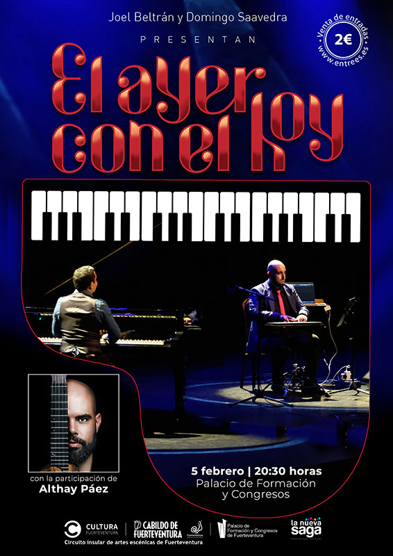 La Consejería de Cultura del Cabildo Insular presenta un singular espectáculo de fusión entre la música clásica y la moderna: “El ayer con el hoy” de Domingo Saveedra y Joel Beltrán, con el artista invitado Althay Páez, el viernes 5 de febrero a partir de las 20:30 horas en el palacio de Formación y Congresos.