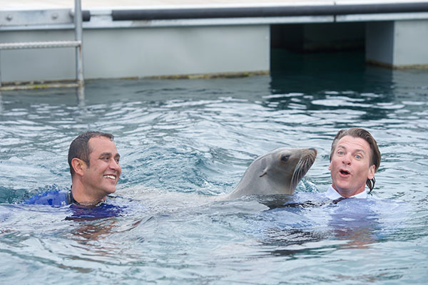 La sesión fotográfica de hoy ha sido en el Oceanarium Explorer de Caleta de Fuste. Ulrich ha jugado y bailado con los leones marinos mientras el fotógrafo captaba el momento. El consejero de Turismo del Cabildo, Blas Acosta, también se ha sumado a los juegos y, provisto de un traje de neopreno, ha saltado al mar con los dos leones marinos.