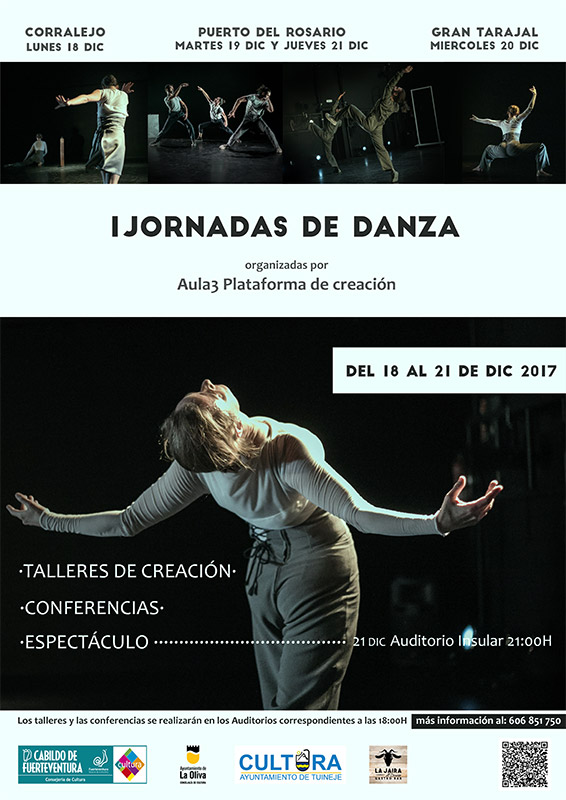 El Aula 3 Plataforma de Creación, en colaboración con el Cabildo de Fuerteventura, lleva esta semana a distintas localidades de la Isla las I Jornadas de Danza. El programa incluye talleres de creación a cargo de miembros del Aula 3, conferencias y un espectáculo de danza en el Auditorio Insular, situado en Puerto del Rosario.