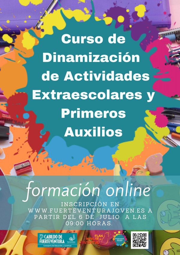 El Cabildo de Fuerteventura, a través de su Consejería de Educación y Juventud, que dirige María Jesús de la Cruz, abre el próximo lunes, día 6 de julio, el plazo de inscripción para el Curso de Dinamización de Actividades Extraescolares y Primeros Auxilios. Se trata de la quinta de las formaciones que forman parte del Programa Fuerteventura Joven Formación Online, que incluye una serie de cursos que se desarrollarán durante todo el verano y parte de septiembre, siempre en formato telemático para poder realizarlos desde casa o desde donde el usuario/a decida pasar el verano.