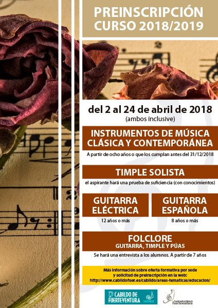 El plazo para presentar solicitudes se extiende hasta el 24 de abril, incluyendo la preinscripción de alumnos de instrumentos de música clásica y contemporánea (a  partir de ocho años de edad), timple solista, guitarra eléctrica (a partir de 12 años), guitarra española (a partir de 8 años) y folclore (a partir de 7 años).