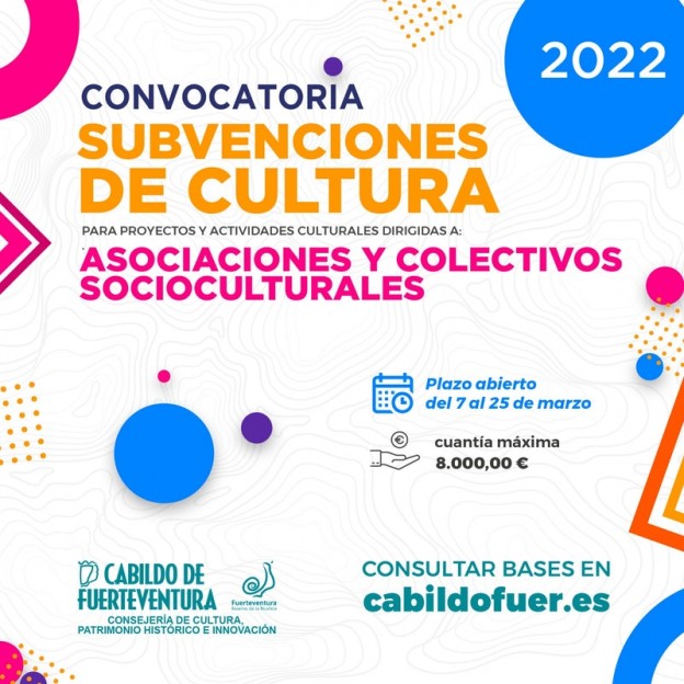 El Cabildo de Fuerteventura, a través del área de Cultura, abre este lunes, día 7 de marzo, la convocatoria de ayudas dirigidas a fundaciones, asociaciones y organizaciones socioculturales que desarrollen actividades y proyectos culturales en la Isla. La Consejería de Cultura concede más de 100.000 euros a esta línea de ayudas, con el objetivo de contribuir a la necesaria recuperación el tejido cultural de Fuerteventura.
