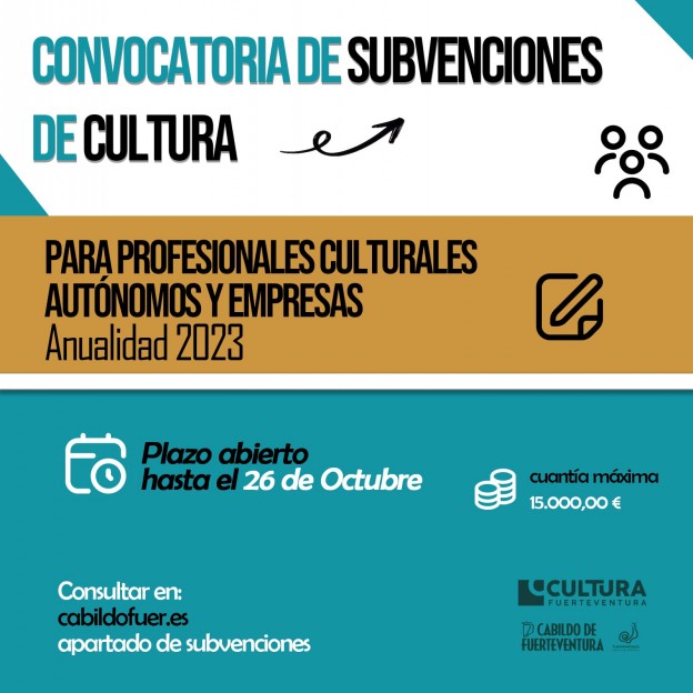 El Cabildo de Fuerteventura, a través de la Consejería de Cultura, abre este jueves, 5 de octubre, la convocatoria de ayudas que se dirigen a respaldar el trabajo de empresas y profesionales que desarrollan actividades culturales en la Isla. Las personas interesadas podrán presentar sus solicitudes hasta el próximo 26 de octubre, a través de la sede electrónica de la Corporación insular en https://sede.cabildofuer.es .