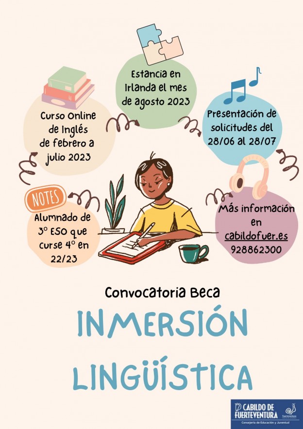 El Cabildo de Fuerteventura, a través de la Consejería de Educación y Juventud, que dirige María Saavedra Hierro, abre, por primera vez, una convocatoria para solicitar la beca de inmersión lingüística 2022, desde hoy, 28 de junio, hasta el próximo 28 de julio, ambos inclusive. La beca está dirigida al alumnado que haya terminado 3º de la ESO en el curso escolar 2021-2022 y se encuentre matriculado en 4º de la ESO para el curso escolar 2022-2023.