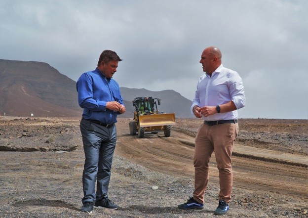 El tren de recebe del Servicio de Obras y Maquinaria del Cabildo de Fuerteventura destinado en la Comarca Sur  trabaja en estos días en el acondicionamiento de los caminos de tierra de la Punta de Jandía y Cofete. El presidente del Cabildo, Sergio Lloret López, junto al alcalde del municipio de Pájara, Pedro Armas, visitó este jueves los trabajos que se están realizando en esta carretera para tenerla en buenas condiciones de cara a la próxima Semana Santa.