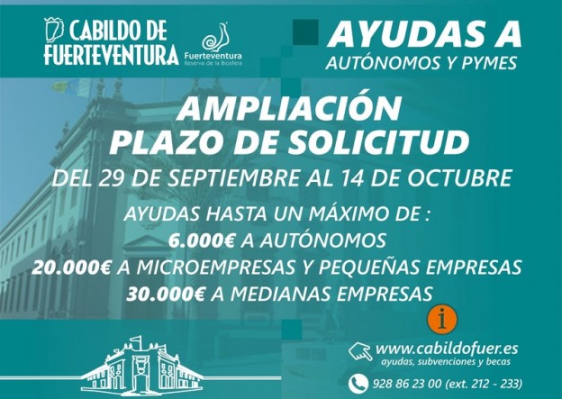 El Cabildo de Fuerteventura, a través de la Consejería de Promoción Económica que dirige Lola García, ha ampliado hasta el 14 de octubre el plazo para solicitar las ayudas dirigidas a autónomos y pymes. Ante la elevada demanda por parte de los solicitantes, y con el objetivo de hacer llegar las subvenciones a la mayor cantidad de beneficiarios, el plazo se prolonga durante diez días hábiles.