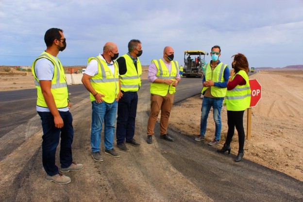 El presidente del Cabildo de Fuerteventura, Sergio Lloret López, junto con la vicepresidenta primera y el vicepresidente segundo, Lola García y Claudio Gutiérrez, respectivamente, han visitado hoy las obras de mejora del firme que se están ejecutando en un tramo de la carretera FV-10 a su paso por la localidad de Lajares, en el término municipal de La Oliva. Los trabajos se ejecutan entre los puntos kilométricos 30,500 y 35,350 que van desde la glorieta de acceso a Lajares y el núcleo de población El Roque.