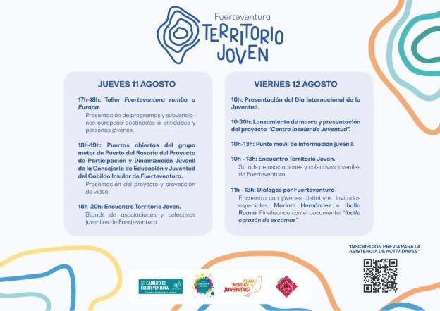 La segunda jornada de actividades comenzará el viernes 12 de agosto, a partir de las 10:00 horas, con la presentación del Día Internacional de la Juventud y la presentación por primera vez del proyecto ‘Centro Insular de Juventud’, que tendrá lugar a las 10.30 horas.