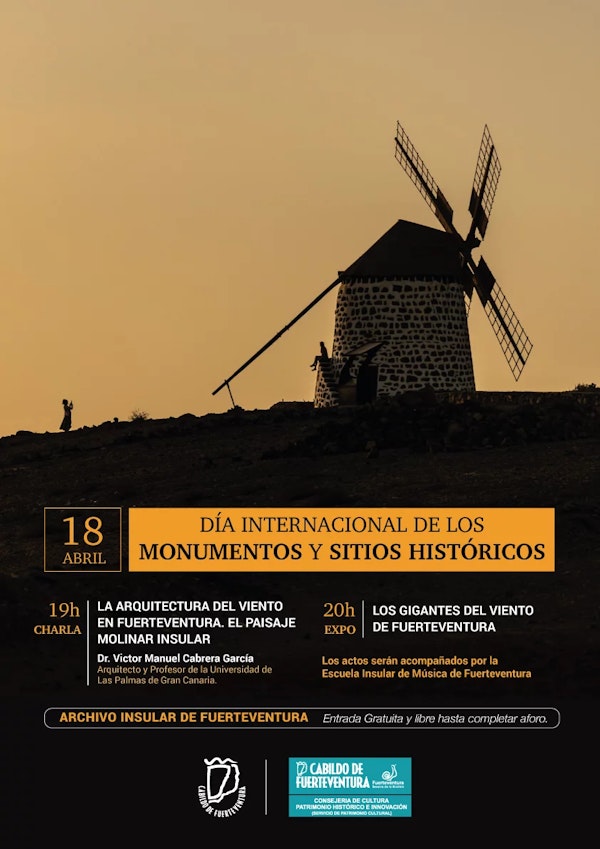El Cabildo de Fuerteventura, a través de la Consejería de Patrimonio Cultural, que dirige Rayco León, celebra el Día Internacional de los Monumentos y Sitios Históricos con una charla sobre evolución histórica de los molinos y molinas en Fuerteventura, a cargo del doctor Víctor Manuel Cabrera García. El acto tiene lugar este jueves, 18 de abril, a las 19.00 horas, en el Archivo General Insular de Fuerteventura.