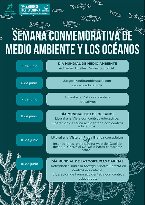 Por otra parte, la Consejería de Sostenibilidad Medioambiental del Cabildo de Fuerteventura desarrollará también la actividad ‘Litoral a la Vista’ con motivo de la celebración del Día Mundial de Medio Ambiente y Día de los Océanos. Esta iniciativa forma parte del Programa de educación ambiental ‘Conocer para Proteger’ y está dirigida a personas adultas mayores de 18 años.