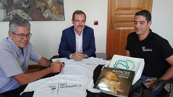 El presidente del Cabildo de Fuerteventura, Marcial Morales, y el consejero de Innovación, Rafael Pérez, felicitan al representante de RB Robotics, Aytor Nuez, y a su equipo empresarial, tras los buenos resultados alcanzados en la Liga Europea de Robótica, recientemente disputada, donde quedaron terceros en la modalidad de Robótica Marina.