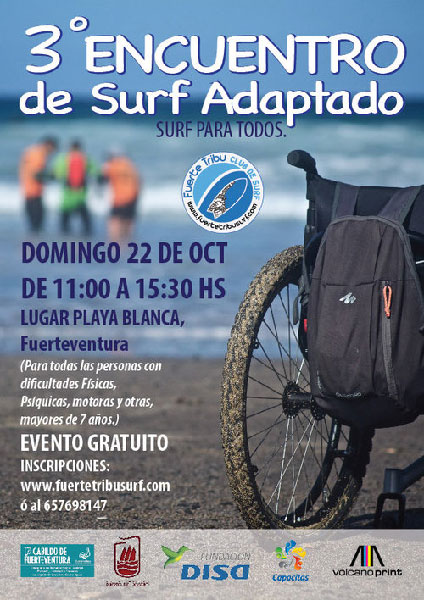 Niños, jóvenes y adultos con discapacidad participarán el próximo 22 de octubre en el III Encuentro de Surf Adaptado ‘Surf para Todos’, que organiza el club ‘Fuerte Tribu’, gracias al apoyo de instituciones como el Cabildo de Fuerteventura, a través de la Consejería de Juventud, que dirige Rosa Delia Rodríguez, y la Fundación Disa.