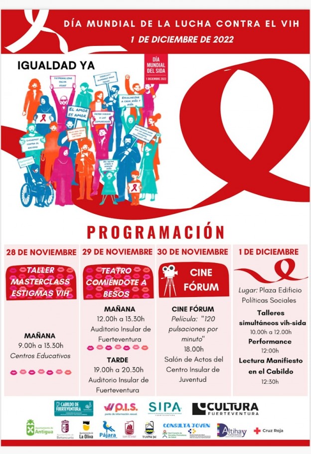 El Cabildo de Fuerteventura, a través de la Consejería de Igualdad y Políticas Sociales, que dirige Adargoma Hernández, ha diseñado una variada programación de actividades para conmemorar el Día Mundial de la Lucha Contra el VIH. El programa se articula desde el Punto de Información Sexual (PIS), con una serie de talleres, teatro y una actividad de cine fórum para público general.