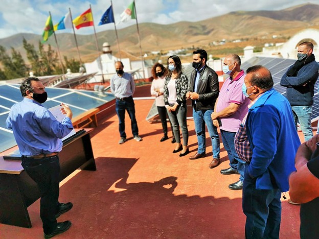 Los Consejeros de Industria y de Promoción Económica del Cabildo Insular, Lolina Negrín y Manuel Hernández respectivamente visitaron en la mañana de hoy lunes 1 de marzo la instalación junto al Alcalde Matías Peña, así como algunos ediles de la Corporación municipal y el Ingeniero responsable del Proyecto, Jose Luis Camino, para conocer “in situ”, sobre la azotea del edificio consistorial, y poner el “broche final” a la instalación de placas fotovoltaicas la cual cuenta con una potencia definitiva pico instalada de 31,160 Kw repartida en 76 módulos fotovoltaicos de 410 W/ud y un equipo de acumulación de energía mediante baterías con Litio.