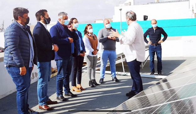 Los Consejeros de Industria y de Promoción Económica del Cabildo Insular, Lolina Negrín y Manuel Hernández respectivamente han visitado la instalación junto al Alcalde de Puerto del Rosario Juan Jiménez, acompañado de la Concejala de Contratación Peña Armas, el Concejal de Obras José Juan Herrera y el Concejal de Participación Ciudadana David Perdomo, así como el Ingeniero responsable del Proyecto, Jose Luis Camino, para conocer “in situ”, sobre la azotea del edificio, la instalación de placas fotovoltaicas la cual cuenta con una potencia definitiva pico instalada de 29,520Kw repartida en 72 módulos fotovoltaicos de 410 W/ud y conectadas a un equipo de acumulación de energía mediante baterías Ion Litio.