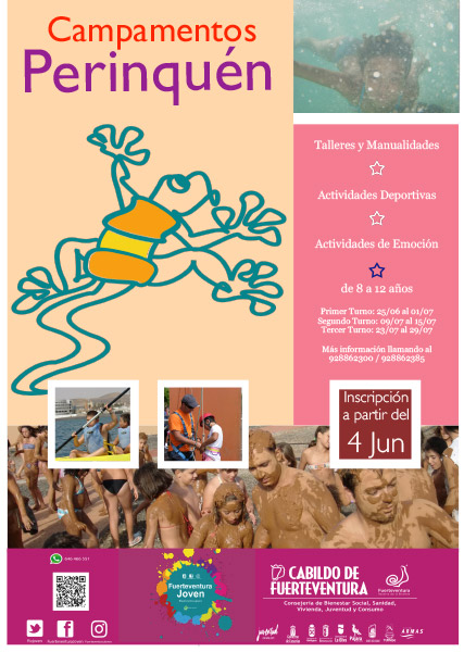 El Cabildo de Fuerteventura, a través de la Consejería de Juventud, que dirige Rosa Delia Rodríguez, abrirá a partir de este lunes, 4 de junio, el plazo para inscribirse en los Campamentos Perinquén.  Se repartirán un total de 150 plazas, en tres turnos diferentes: del 25 de junio al 1 de julio, del 9  al 15 de julio y del 23 al 29 de julio.