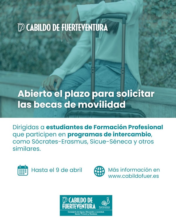 El Cabildo de Fuerteventura, a través de la Consejería de Educación que dirige Adargoma Hernández, ha abierto el plazo de la convocatoria de becas de movilidad para alumnado de Formación Profesional en la Isla, dentro de programas de intercambio como Sócrates-Erasmus, Sicue-Séneca y otros similares.
