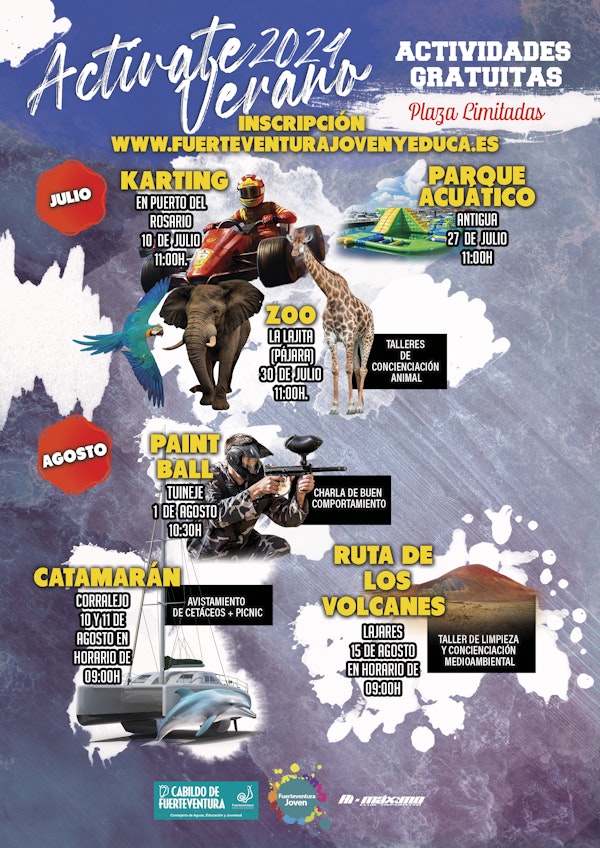 El Cabildo de Fuerteventura, a través de la Consejería de Educación y Juventud, ha abierto el plazo para inscribirse en las actividades del programa Actívate Verano 2024, dirigidas a jóvenes de entre 12 y 30 años. Se desarrollarán durante lo meses de julio y agosto con actividades de karting en Puerto del Rosario, parque acuático en Antigua, visita al Oasis Wildlife Fuerteventura en la Lajita, paintball en Tuineje, avistamiento de cetáceos en Corralejo y ruta de los volcanes en Lajares con taller de limpieza y concienciación medioambiental.