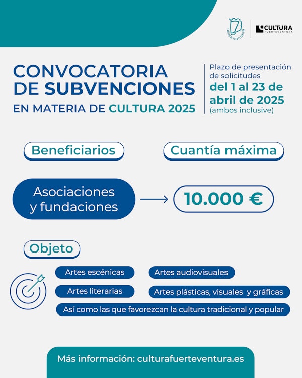 El Cabildo Insular de Fuerteventura abre la convocatoria de las subvenciones que dirige a asociaciones y colectivos que desarrollan actividades y proyectos culturales en la Isla. Unas ayudas que buscan fomentar actividades que enriquezcan la oferta cultural insular y promuevan valores como la inclusión, la sostenibilidad y la diversidad cultural.