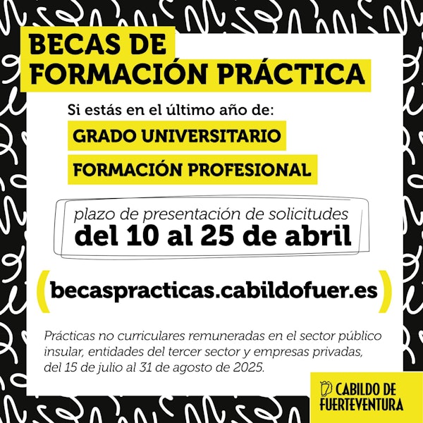 El Cabildo de Fuerteventura, a través de la Consejería de Educación, ha abierto la convocatoria para solicitar sus Becas de Formación Práctica, dirigidas a estudiantes de formación profesional y grado universitario que estén finalizando sus estudios en este curso. Las personas interesadas pueden presentar sus solicitudes hasta el 25 de abril, en la página web becaspracticas.cabildofuer.es