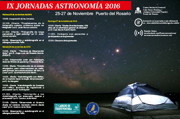 La Agrupación Astronómica de Fuerteventura (AAF) y el Cabildo de Fuerteventura, a través de la Consejería de Juventud, que dirige Rosa Delia Rodríguez Clavijo, organizan las IX Jornadas de Astronomía, que tendrán lugar del 25 al 27 de noviembre. En esta edición, las jornadas se trasladan al Centro Insular de Juventud de Puerto del Rosario (antigua Universidad Popular), con el objetivo de facilitar al público general la asistencia a este evento, manteniéndose en el Albergue Juvenil de Tefía las actividades nocturnas de observación astronómica y astrofotografía.